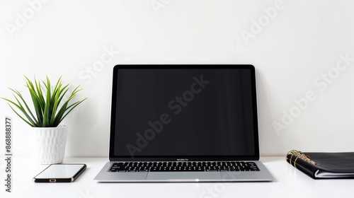 © Shozib, Fototapeta premium Modern laptop computer displaying a blank screen is sitting on a work desk with a smartphone, a plant, and a notebook