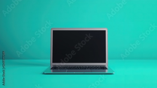 © HIRA STOCK, Fototapeta premium Modern Laptop Computer with Blank Black Screen Mockup Centered on a Vibrant Solid Teal Studio Background for Technology Concepts