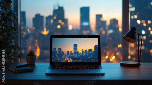 © Марина Сухина, Obraz premium Modern laptop displaying a generic cityscape chroma key mockup template is placed on a desk near a window with a real cityscape sunset view and some plants