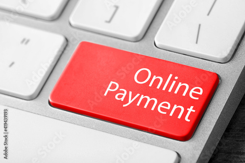 © New Africa, Fototapeta premium Modern laptop keyboard with text Online Payment on red button, closeup view