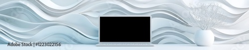 © Sangsung, Naklejka premium Modern Laptop on Minimalist Desk with Wave Design