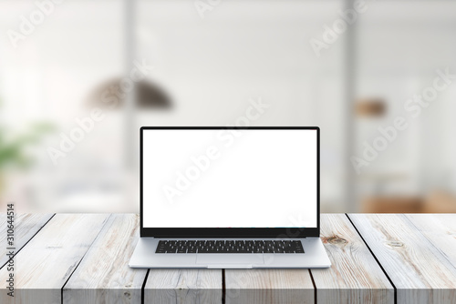 © Stanisic Vladimir, Fototapeta premium Modern laptop on office desk mockup. Isolated screen for app or website promotion