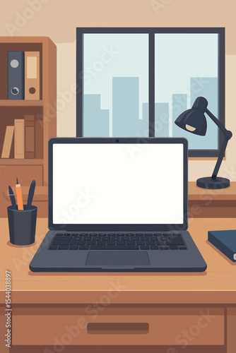 © Vector, Fototapeta premium Modern laptop with blank screen on wooden office desk in contemporary workspace. Vector illustration of home office interior, desk lamp, window, bookshelf, cityscape. Cozy work environment