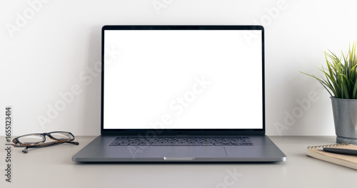 © Abdull, Fototapeta premium Modern laptop with blank white screen on minimalist desk. Mock up template
