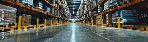 © pingpao, Fototapeta premium Modern large warehouse interior with high shelves, pallets, and containers. Industrial storage space with organized inventory and logistics.