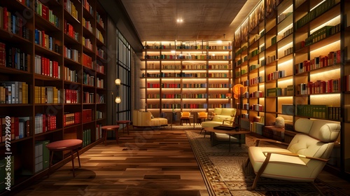 Obraz premium Modern Library Interior Design with Bookshelves and Comfortable Seating