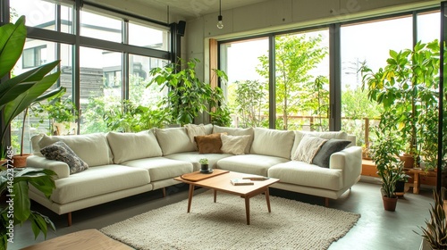 © dany, Fototapeta premium Modern, light-filled living room with a comfortable sectional sofa and ample greenery