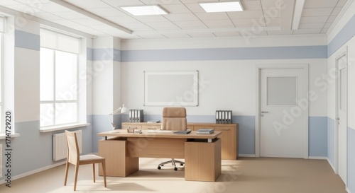 Fototapeta premium Modern, light-filled office space with light wood furniture and pale blue...