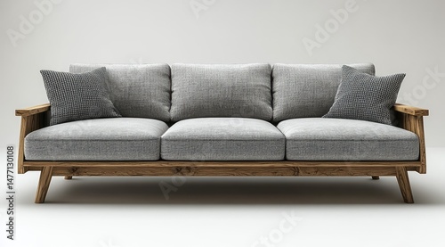 © GASTAN ALVARENDRA ST, Fototapeta premium Modern light gray couch with light brown wooden frame.