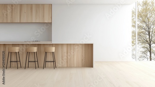 © Bella, Fototapeta premium Modern light wood kitchen with bar stools and window view. Possible use Interior design