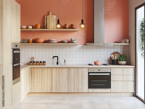 © Agus, Fototapeta premium Modern Light Wood Kitchen With Coral Walls And Minimalist Design