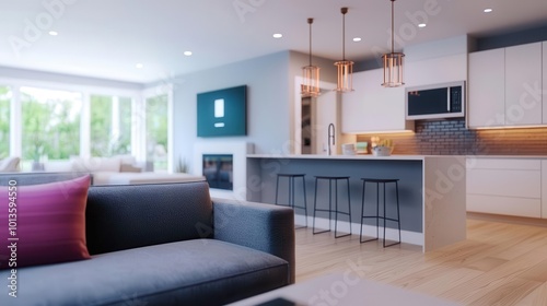Fototapeta premium Modern living room and kitchen combination with elegant decor and natural light, featuring stylish furniture and inviting atmosphere.