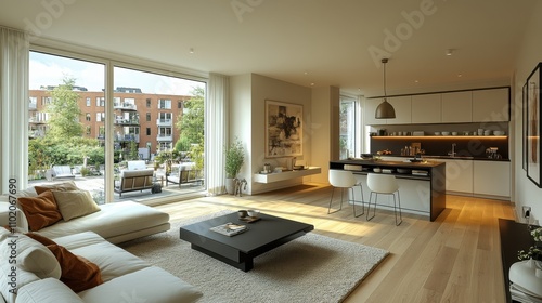Fototapeta premium Modern Living Room and Kitchen Interior with Cozy Decor and Natural Light Overlooking Outdoor Patio in Contemporary Apartment Setting