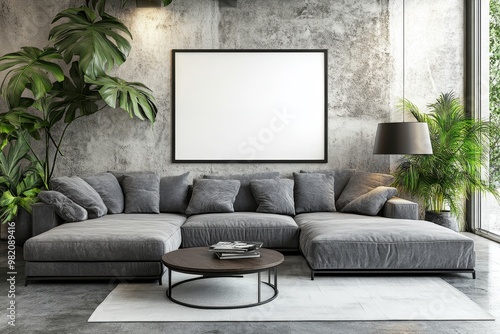 Fototapeta premium Modern Living Room, Concrete Wall, Comfortable Sofa, Houseplants, Blank Picture Frame