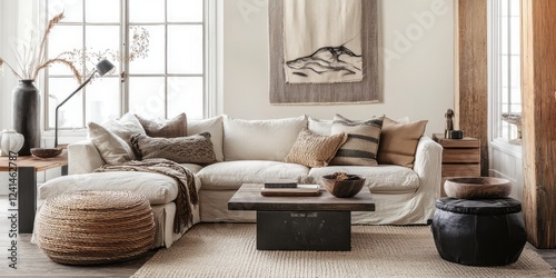 Fototapeta premium Modern Living Room Decor Featuring Neutral Tones and Textured Furnishings