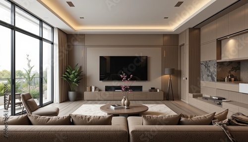 Fototapeta premium Modern living room design contemporary home interior cozy environment wide...