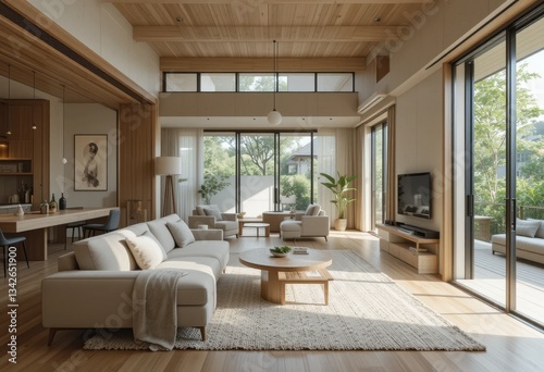Naklejka premium Modern living room design contemporary home interior photography cozy atmosphere wide angle minimalist aesthetics
