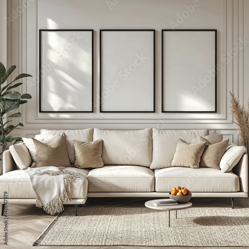 © Shahida, Fototapeta premium Modern living room displays sofa beneath three frames with interior plants and textured rug