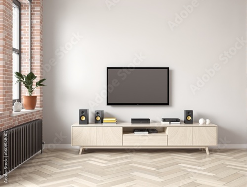 © lina, Obraz premium Modern living room features a wall- television and audio system.