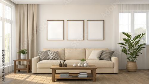 Fototapeta premium Modern living room featuring a neutral sofa, coffee table, and three blank...