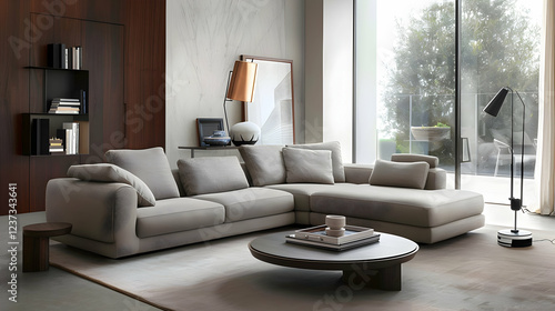 Fototapeta premium Modern living room featuring a sectional sofa, coffee table, and large...