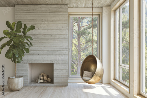 Fototapeta premium Modern living room featuring a unique hanging chair and indoor plant with large windows