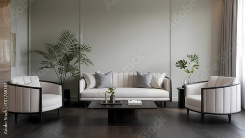 © MatandSterre, Fototapeta premium Modern living room featuring a white sofa and two matching chairs, with plants and a low coffee table.