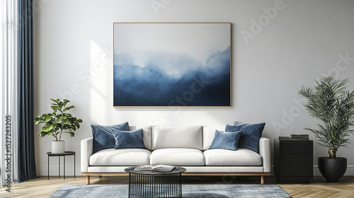 Fototapeta premium modern living room featuring stylish sofa, decorative pillows, and large abstract painting