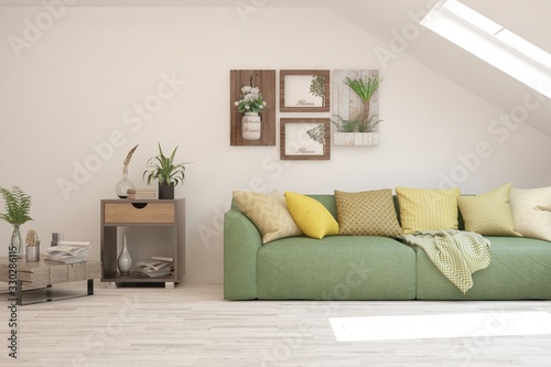 © AntonSh, Fototapeta premium Modern living room in white color with sofa. Scandinavian interior design. 3D illustration