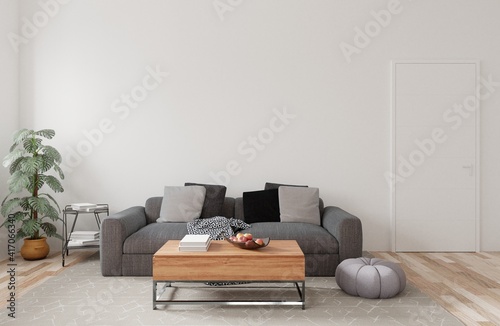© stationidea, Fototapeta premium Modern living room interior design. gray sofa on white wall.