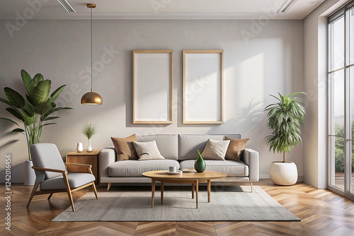 © setan cell, Fototapeta premium Modern living room interior design mockup, sunlight, hardwood floor, plants