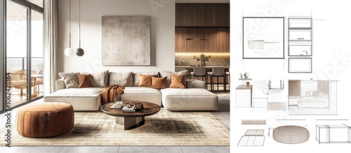 © BloomArt, Fototapeta premium Modern living room interior design with a sectional sofa, ottoman, coffee table, rug, and artwork with a blueprint of the space to the right.