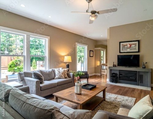 © fara, Fototapeta premium Modern living room interior design with grey sofas, wooden coffee table, fireplace, and large windows.
