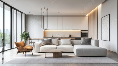 Obraz premium Modern Living Room Interior Design with White Couch and Brown Armchair