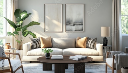 © Rere_Art151, Obraz premium Modern Living Room Interior Design with White Sofa and Wooden Coffee Table