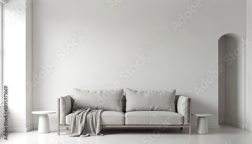 Fototapeta premium Modern living room interior mock up in Scandinavian style. Minimalist design with white sofa and side tables. Empty wall background for design presentation. Comfortable apartment, home decor.