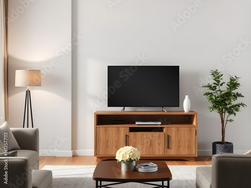 © Redhill, Obraz premium Modern Living Room Interior Mockup with TV Cabinet, Lamp, Table, Flowers, and Indoor Plants (AI Generated)