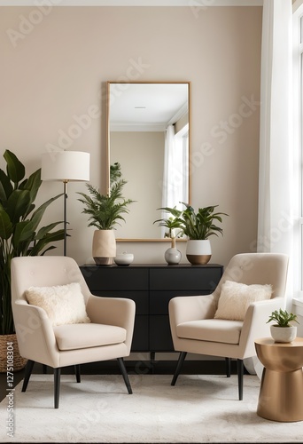 Fototapeta premium Modern Living Room Interior with Beige Armchairs and Gold Accents