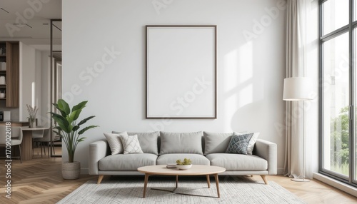 Fototapeta premium Modern living room interior with blank picture frame above a gray sofa and a...