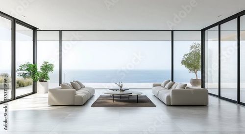 © jemb, Fototapeta premium Modern living room interior with expansive windows and serene ocean view