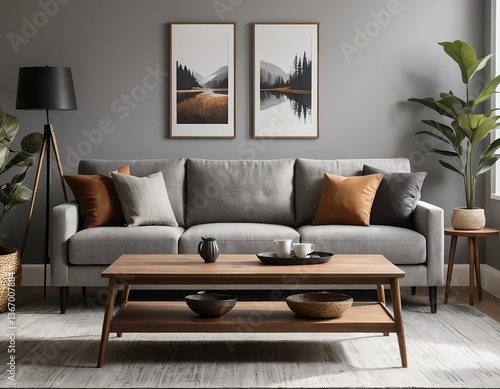 Fototapeta premium Modern Living Room Interior with Grey Sofa and Wooden Coffee Table