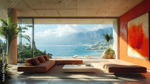 © embun, Fototapeta premium Modern Living Room Interior with Ocean View 3D Illustration