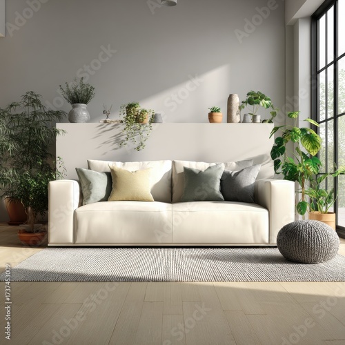 Fototapeta premium Modern Living Room Interior with Sofa and Lush Greenery