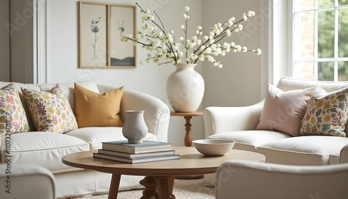 © MrSani, Obraz premium Modern living room interior with sofa wooden table and antique jars