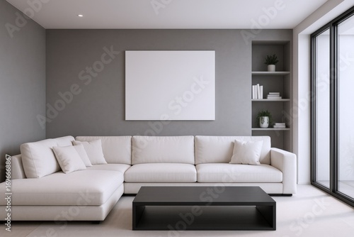Fototapeta premium Modern Living Room Interior with White Sofa, Black Coffee Table, and Blank...