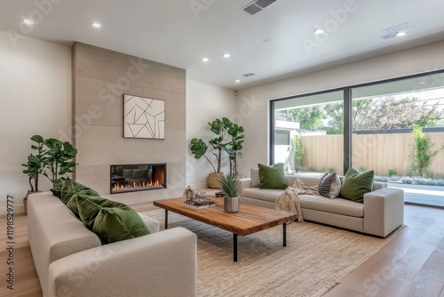 Fototapeta premium Modern living room minimalist design fireplace cozy ambiance light gray sofas green cushions