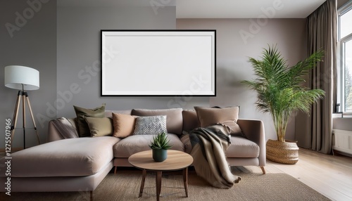© netsay, Obraz premium Modern Living Room Mockup with Frame A Chic Minimalist Space Bathed in Soft Light and Textured Neutrals, Perfect for Digital Art, Home Decor, or Design Inspiration.