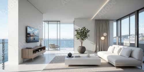 Fototapeta premium Modern Living Room Sea View Luxury modern white living room with sofa TV plant ocean view