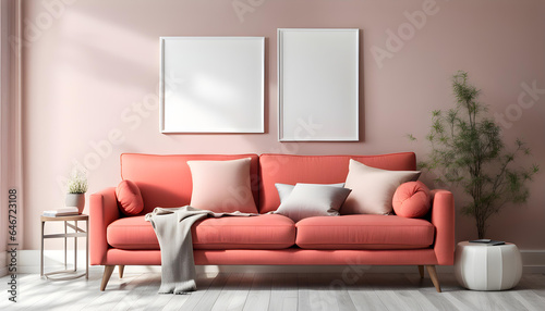 Fototapeta premium Modern living room simple interior design with pastel red fabric sofa and cushions and blank poster frame