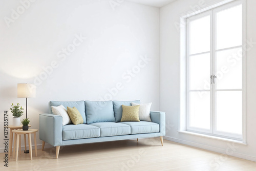 Fototapeta premium Modern living room window light blue sofa side tables plants